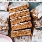 Soft, chewy iced oatmeal bars made in an 8x8 pan with quick oats, brown sugar, molasses and cinnamon; topped with vanilla icing.